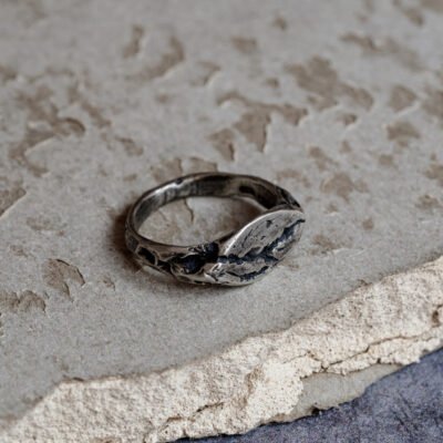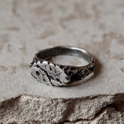 Ręcznie rzeźbiony srebrny pierścionek o fakturze skały. Satynowe wykończenie, oksyda i surowy charakter. Rozmiar 21,5.