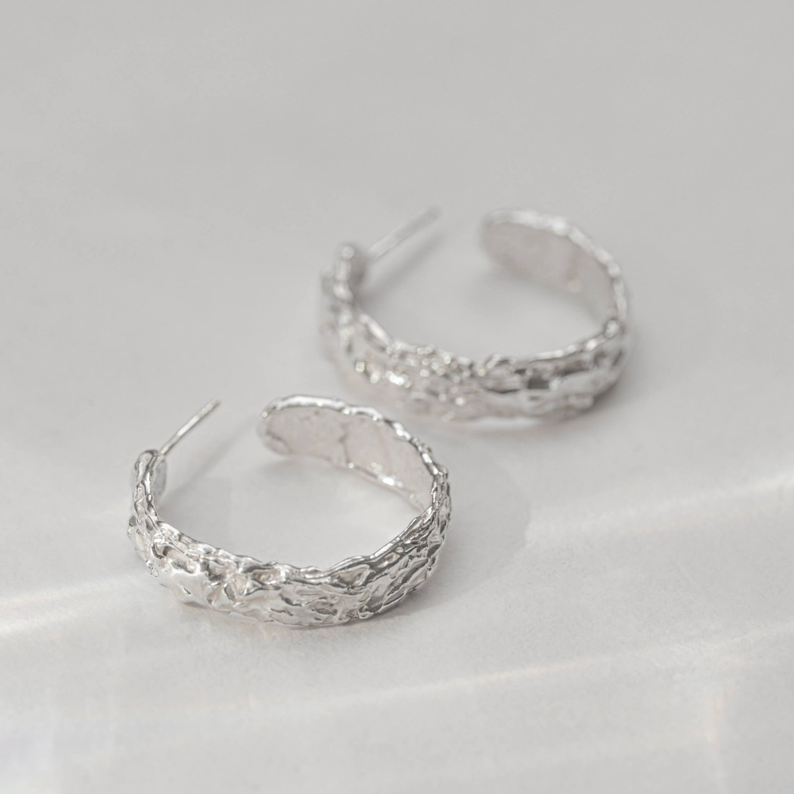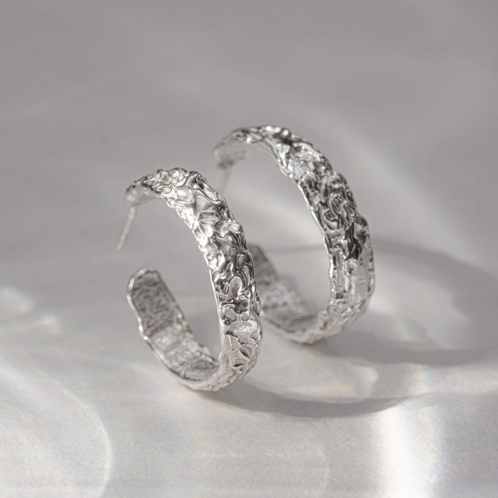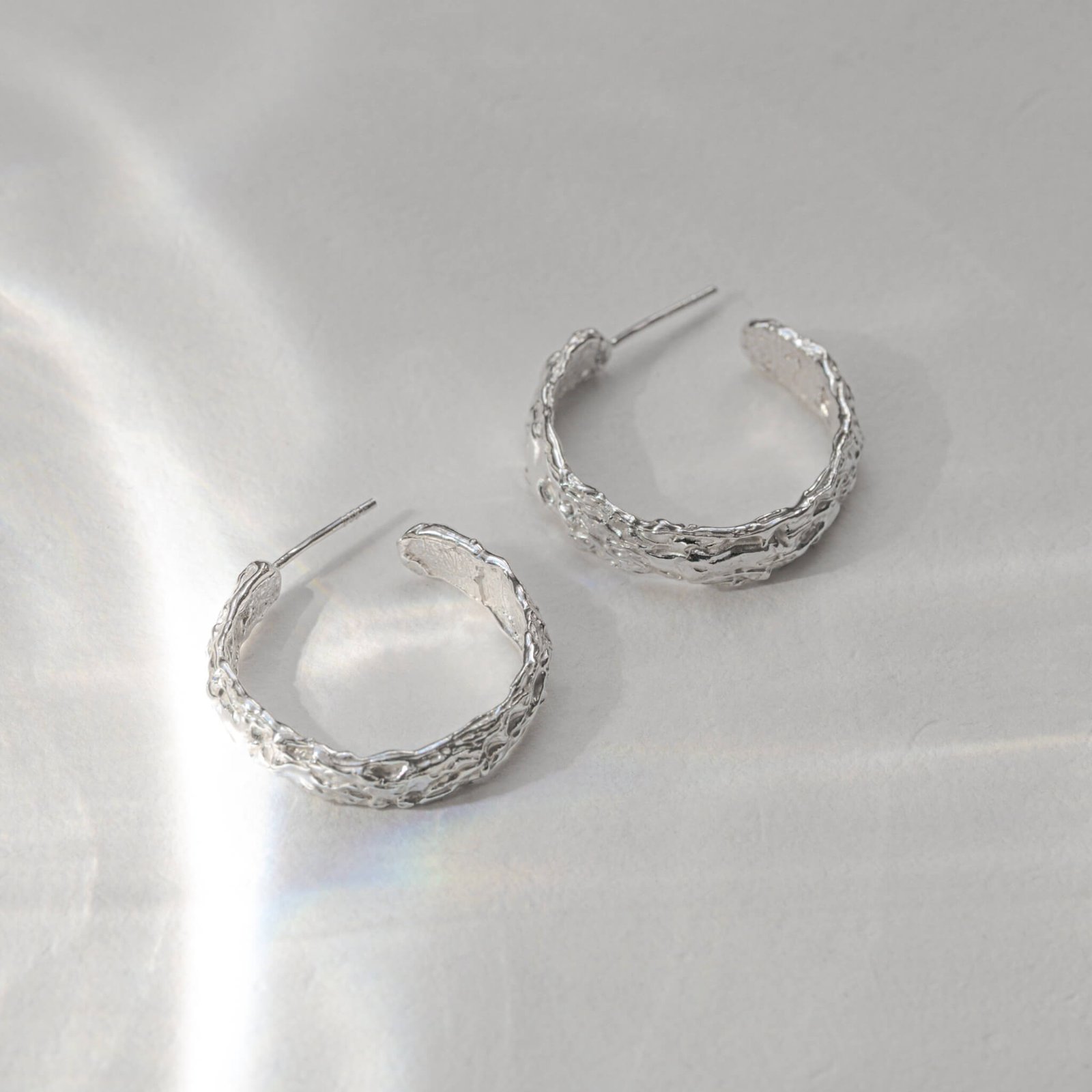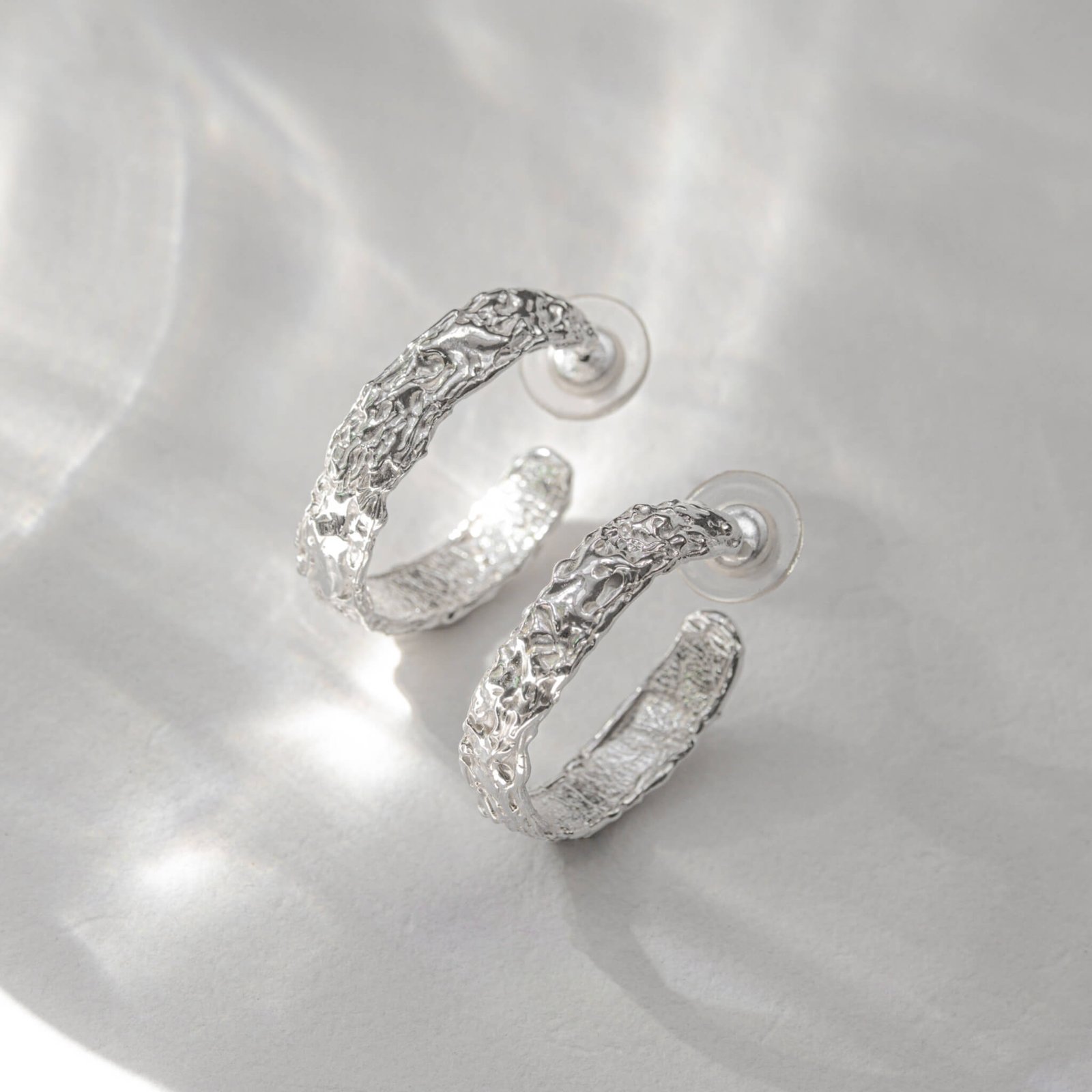 Kolczyki mają formę lekkich, rzeźbiarskich kół o naturalnej fakturze. Ich średnica wynosi około 2,7 cm – dzięki temu subtelnie podkreślają rysy twarzy, ale nie dominują stylizacji. Dobrze odnajdują się zarówno w codziennym noszeniu, jak i w bardziej świadomych, artystycznych zestawach.