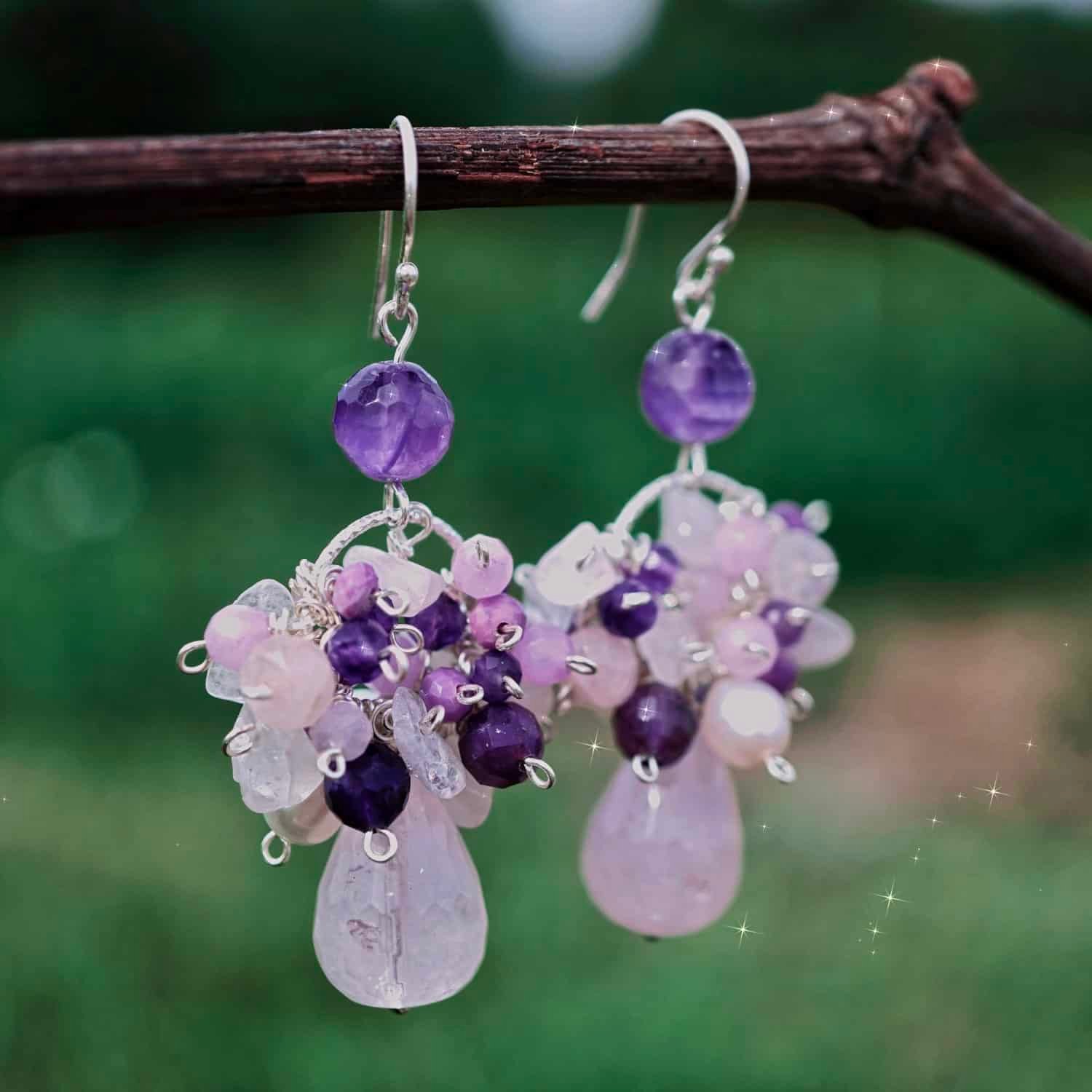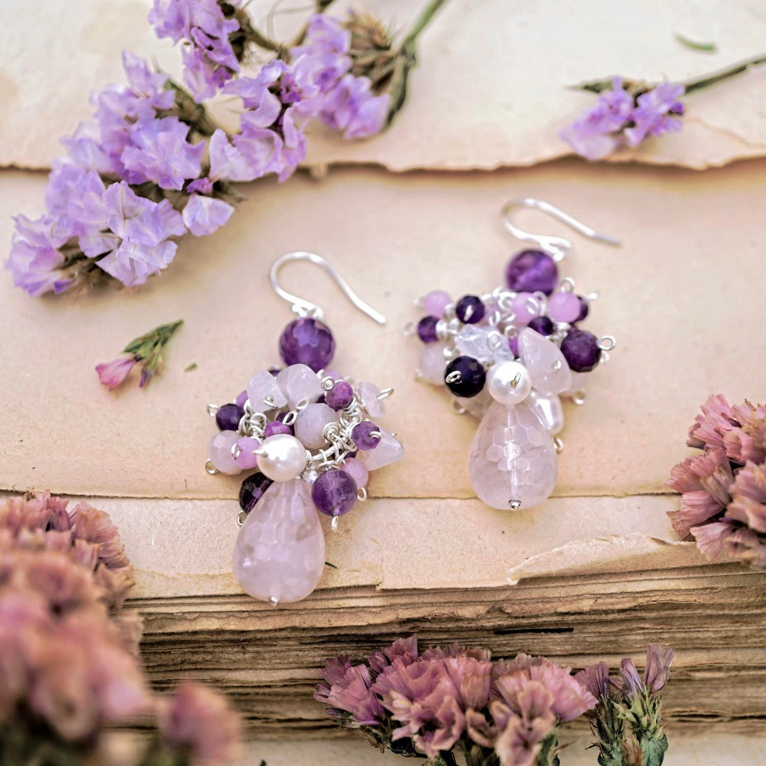 Kolczyki „Płatki Róż” – z Kwarcem Różowym i Ametystem