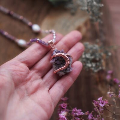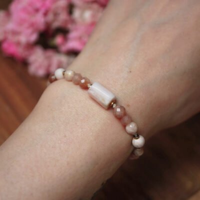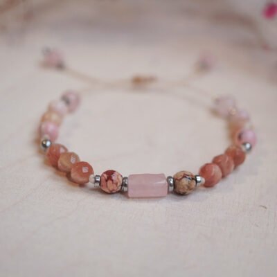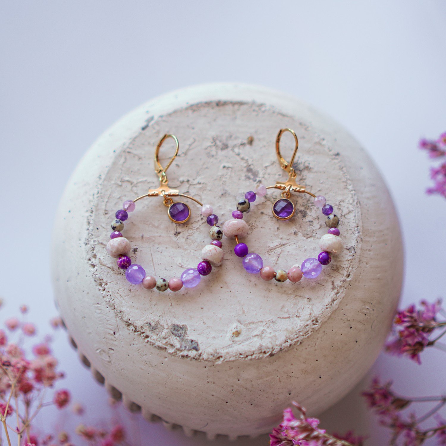 W centrum kompozycji znajduje się kamień słoneczny – minerał kojarzony z radością, optymizmem i siłą życiową. Jego złociste refleksy przyciągają wzrok i dodają lekkości stylizacji. Wspólnie z jadeitem, rodonitem, jaspisem dalmatyńskim oraz ametystem tworzy harmonijny zestaw wspierający dobre samopoczucie. Każdy z tych kamieni niesie inną jakość – dzięki temu kolczyki wzmacniają energię noszącej osoby na wielu poziomach.