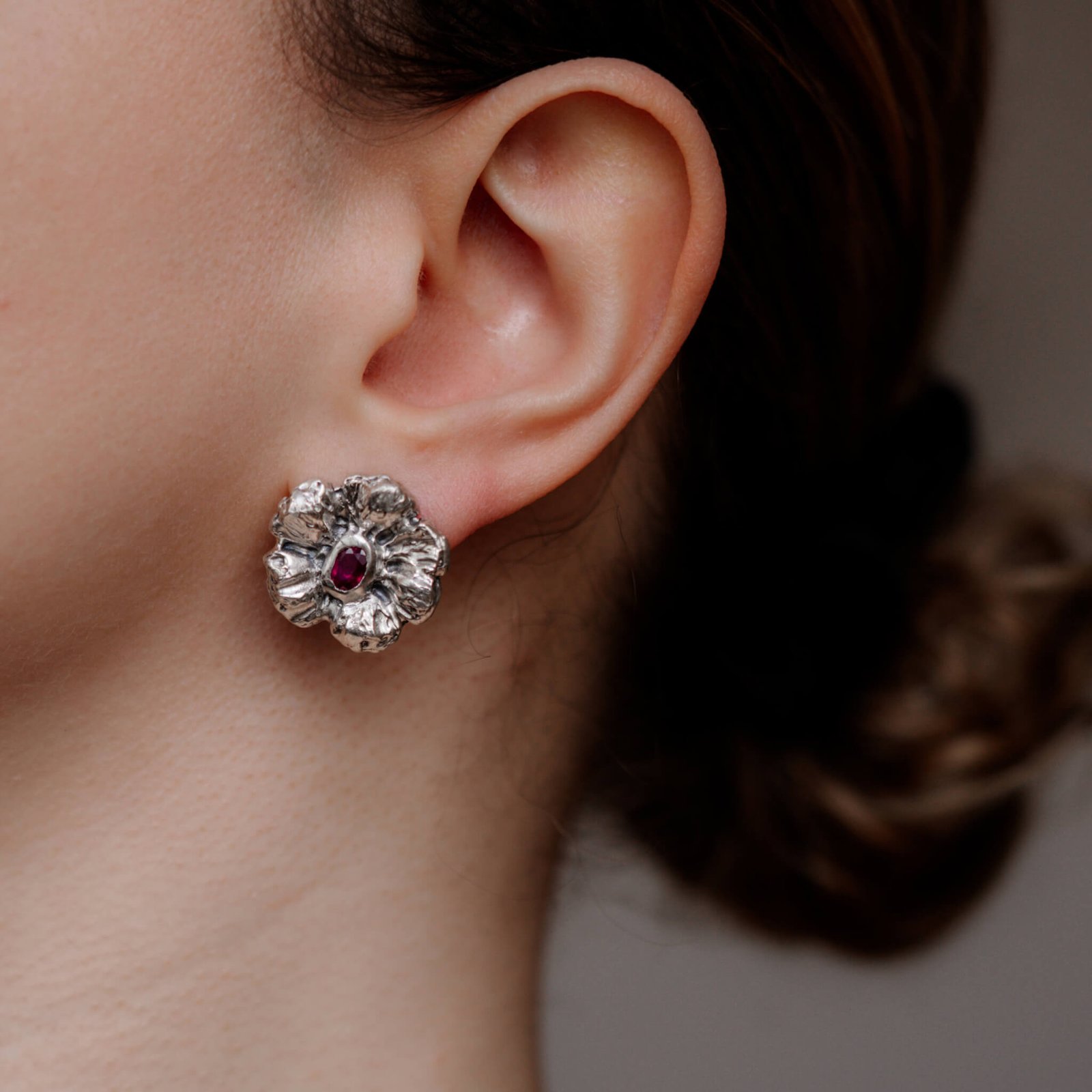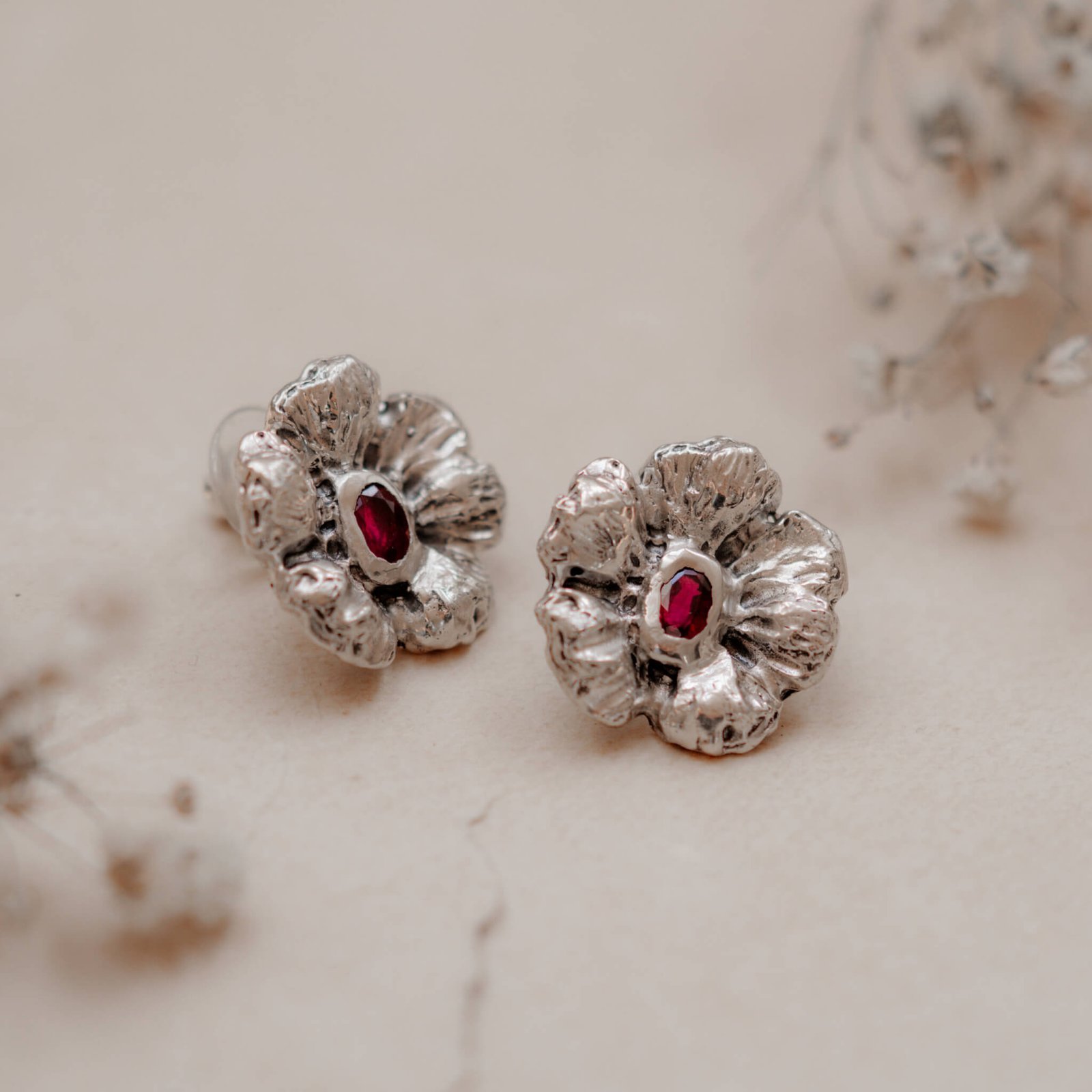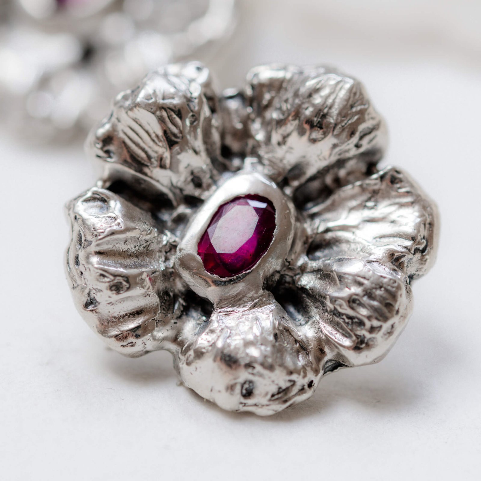 Ręcznie robione kolczyki ze srebra próby 925 z naturalnymi rubinami, inspirowane kwiatami. Delikatne w formie, wyraziste w charakterze – biżuteria z duszą, której nie da się powtórzyć.