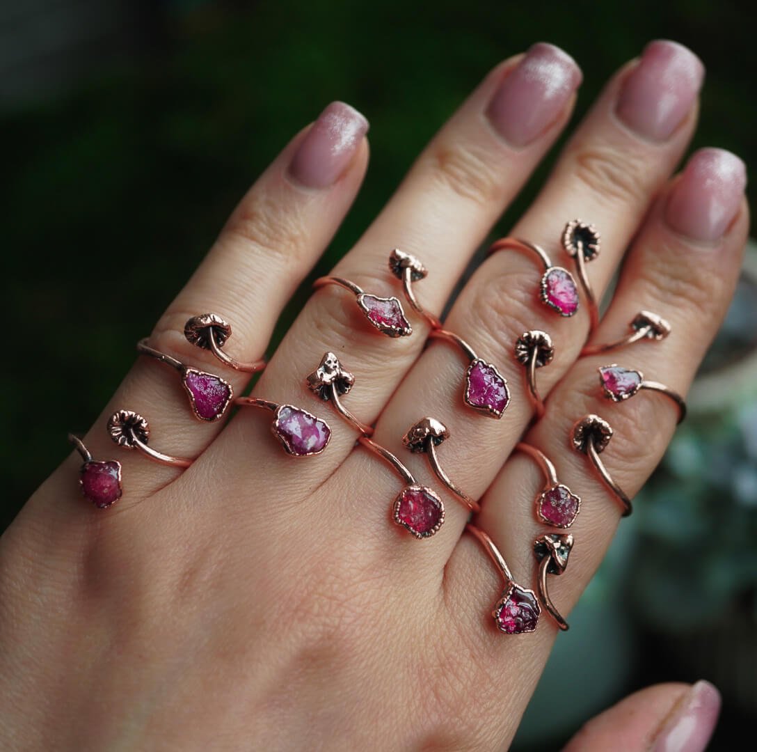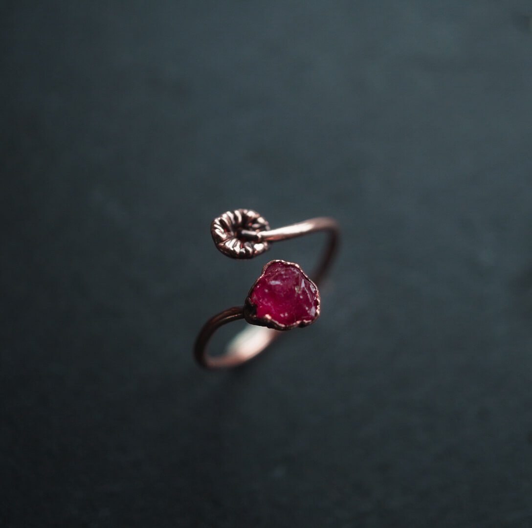Elegancki pierścień grzybek z surowym rubinem wykonany z miedzi. Unikalny i regulowany rozmiar (14.5), idealny dodatek do codziennego i specjalnego stylu.