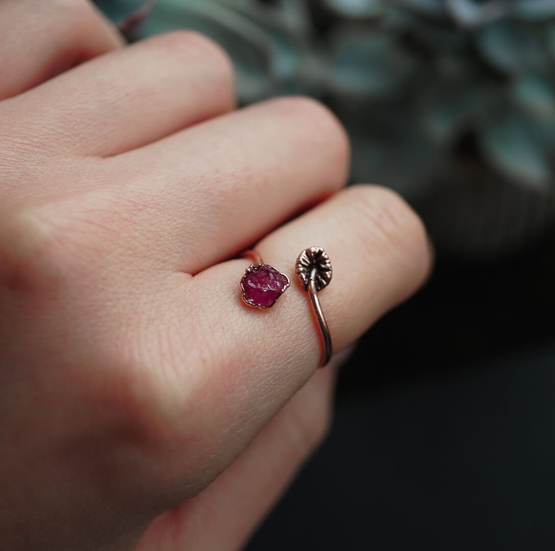 Miedziany Pierścień Grzybek z Surowym Rubinem – Lekko Regulowany (Rozmiar 14.5)
