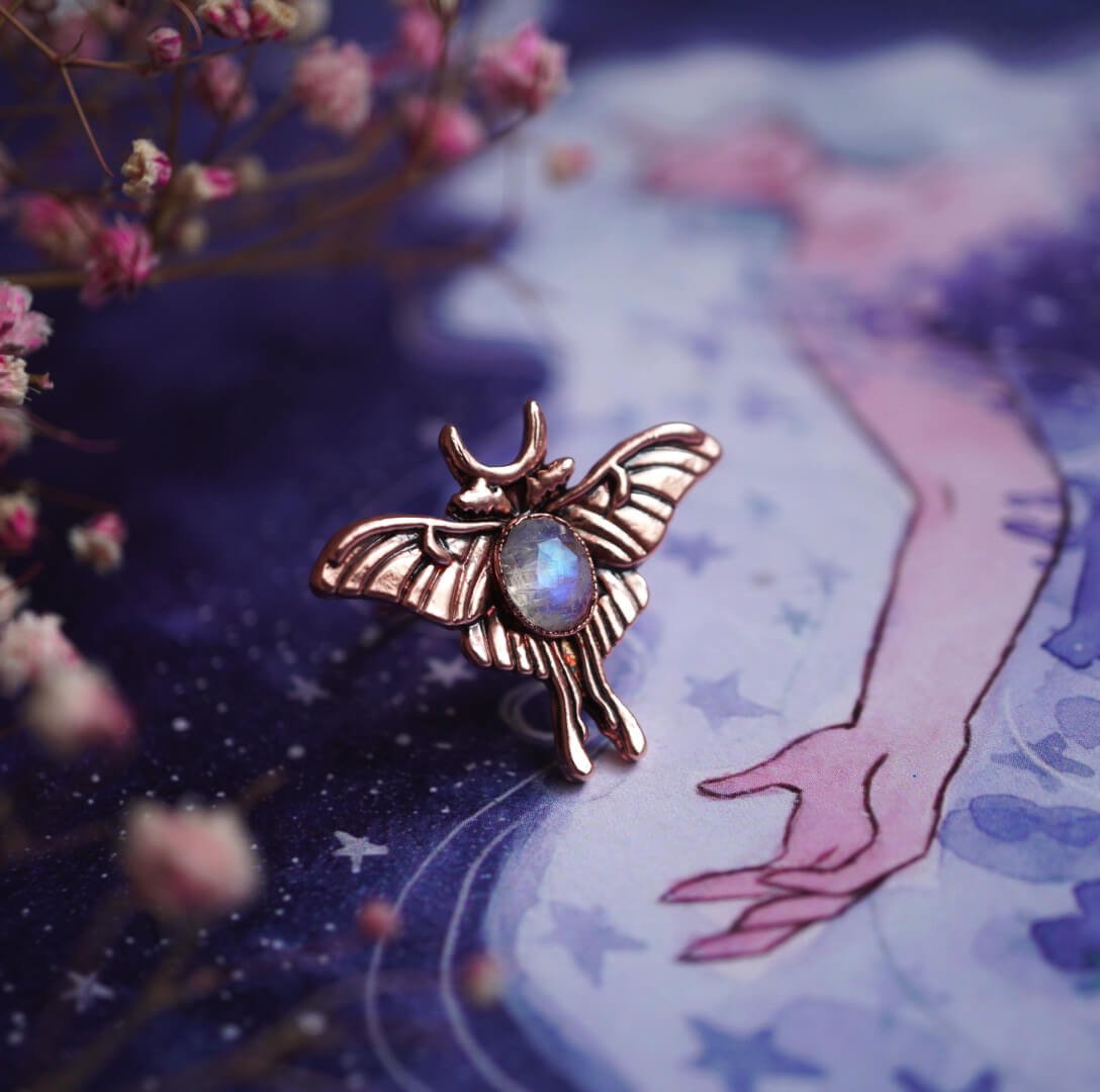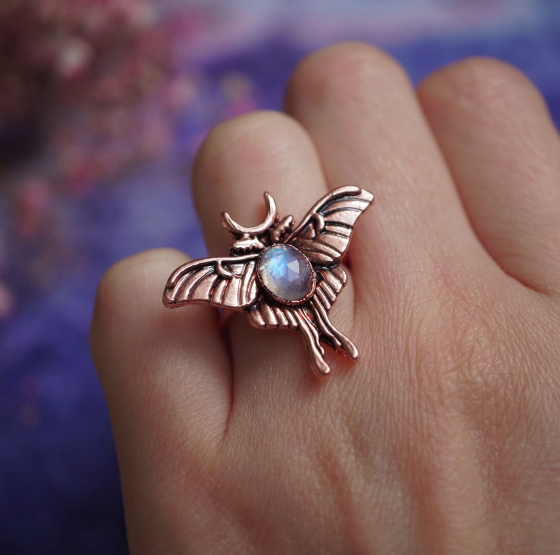 Wykonałam ten pierścionek ręcznie z czystej miedzi i dodałam do niego opalizujący kamień księżycowy. Inspiracją była dla mnie natura – ćma, która w nocy podąża za światłem.