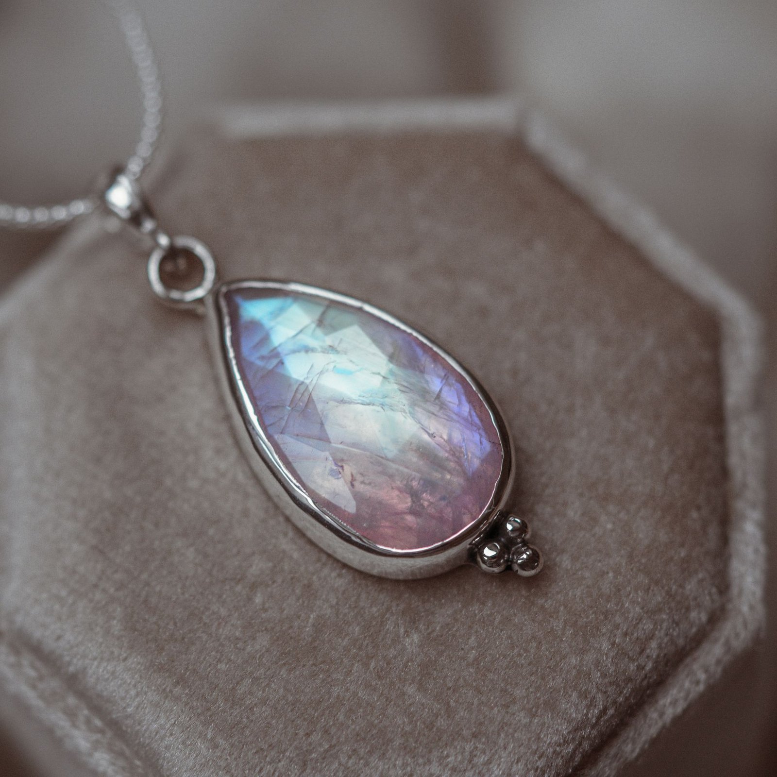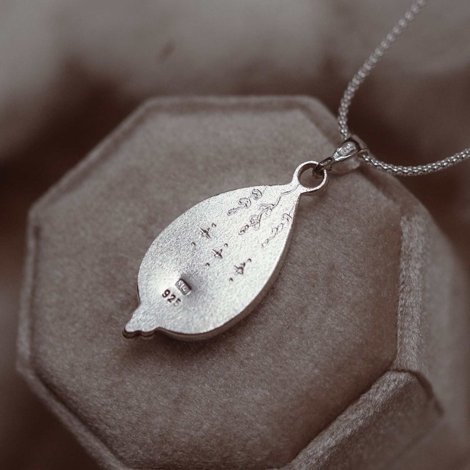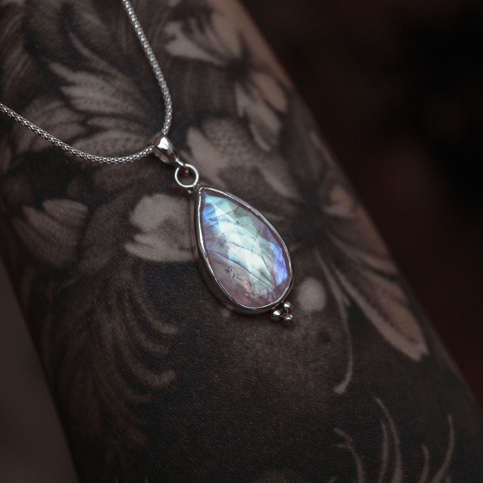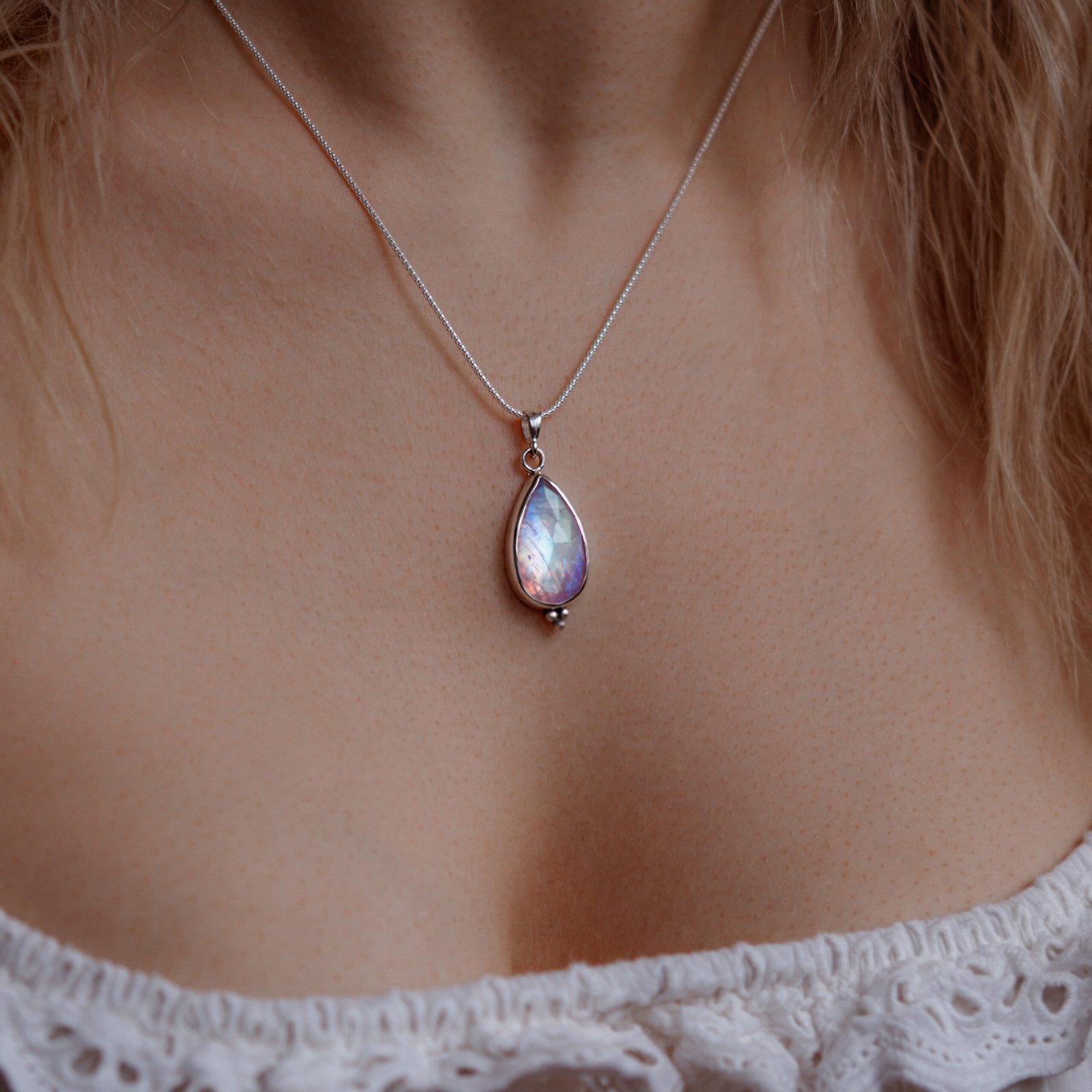 Ten srebrny naszyjnik z kamieniem księżycowym Quiet Glow powstał jako spokojna, subtelna forma biżuterii, w której najważniejszy jest kamień i światło. Kamień księżycowy delikatnie reaguje na ruch i kąt patrzenia. W jego wnętrzu pojawiają się chłodne błękity, jasne refleksy i mleczna poświata, które zmieniają się miękko w zależności od oświetlenia. Dzięki temu naszyjnik nie wygląda zawsze tak samo i żyje razem z osobą, która go nosi.