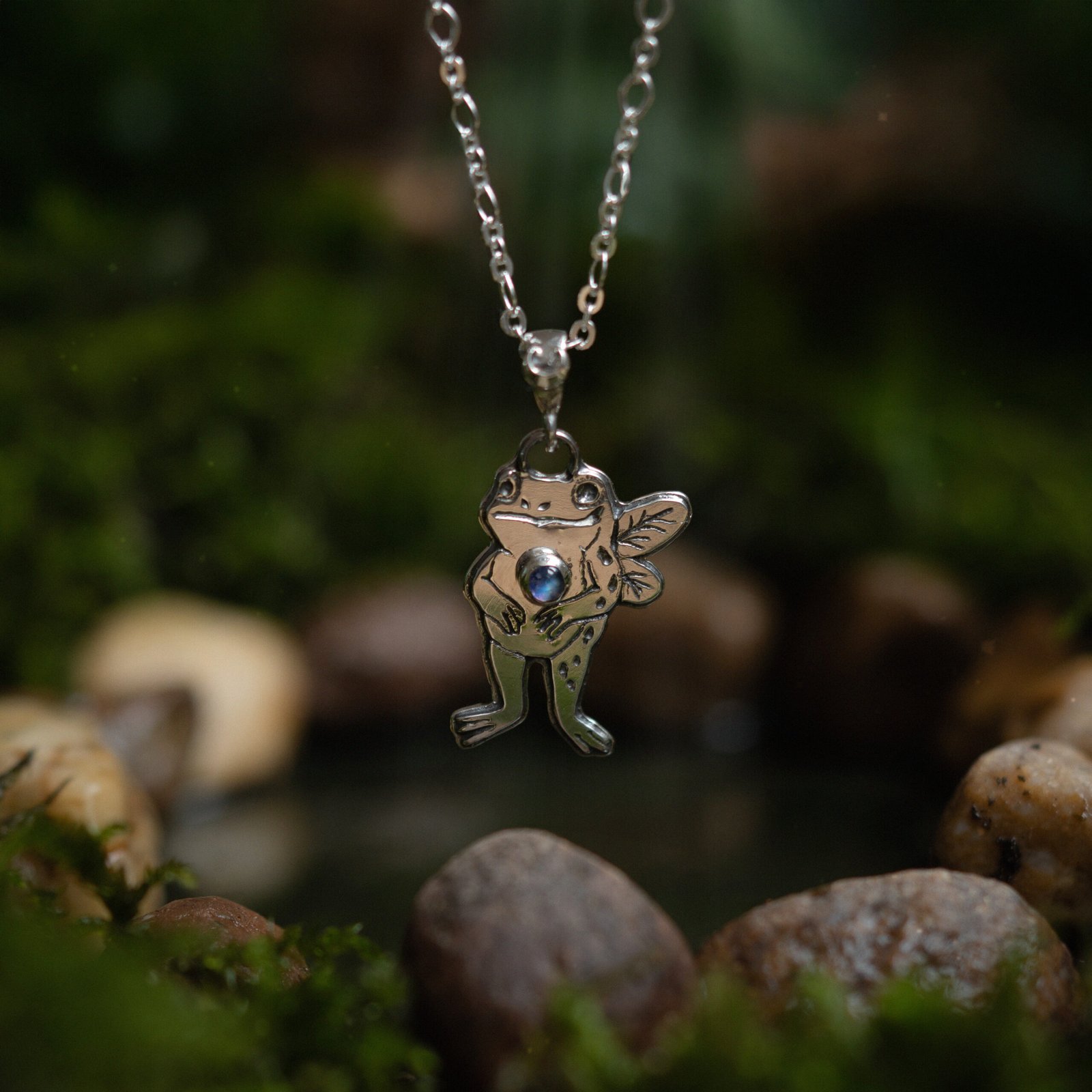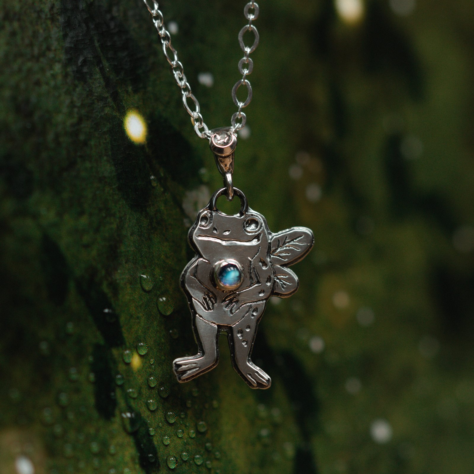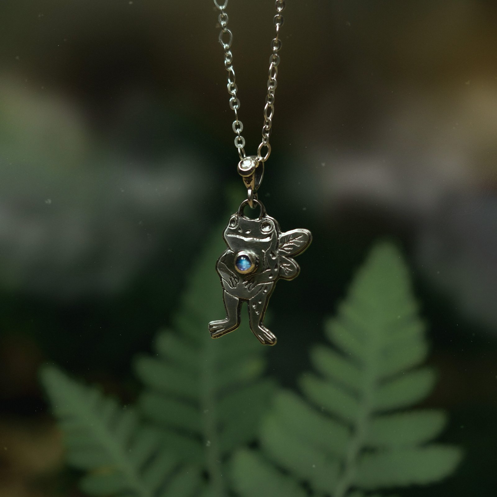 Srebrny naszyjnik z kamieniem księżycowym w formie żabki powstał z myśli o małej, zaczarowanej istotce — jednocześnie uroczej, figlarnej i odrobinę magicznej. To biżuteria, która nie udaje powagi. Ma w sobie lekkość, humor i subtelny blask, który przyciąga spojrzenie dopiero po chwili.